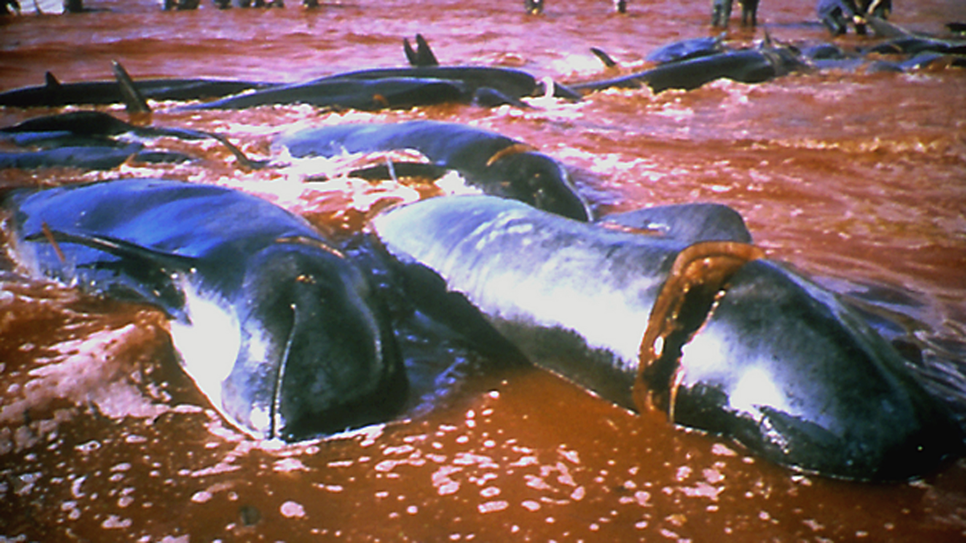 Diente die Jagd auf die bis zu knapp acht Meter langen zu den Delfinen gehörenden Grindwale (Globicephala melas) früher der Nahrungsbeschaffung, so ist sie heute zu einem alljährlichen sinnlosen Mordritual mit Volksfestcharakter geworden. Die Tiere werden in enge Buchten getrieben, wo die Jäger ihnen Eisenhaken ins Blasloch rammen, um sie orientierungslos zu machen und an Land zu ziehen, dann werden Rückgrat und Kopfarterien mit Messern durchgeschnitten. Noch lebend verbluten sie langsam. Wal- und Delfinfleisch gehören noch immer zum Speiseplan der Inselbewohner, auch wenn sie längst nicht mehr darauf angewiesen sind.